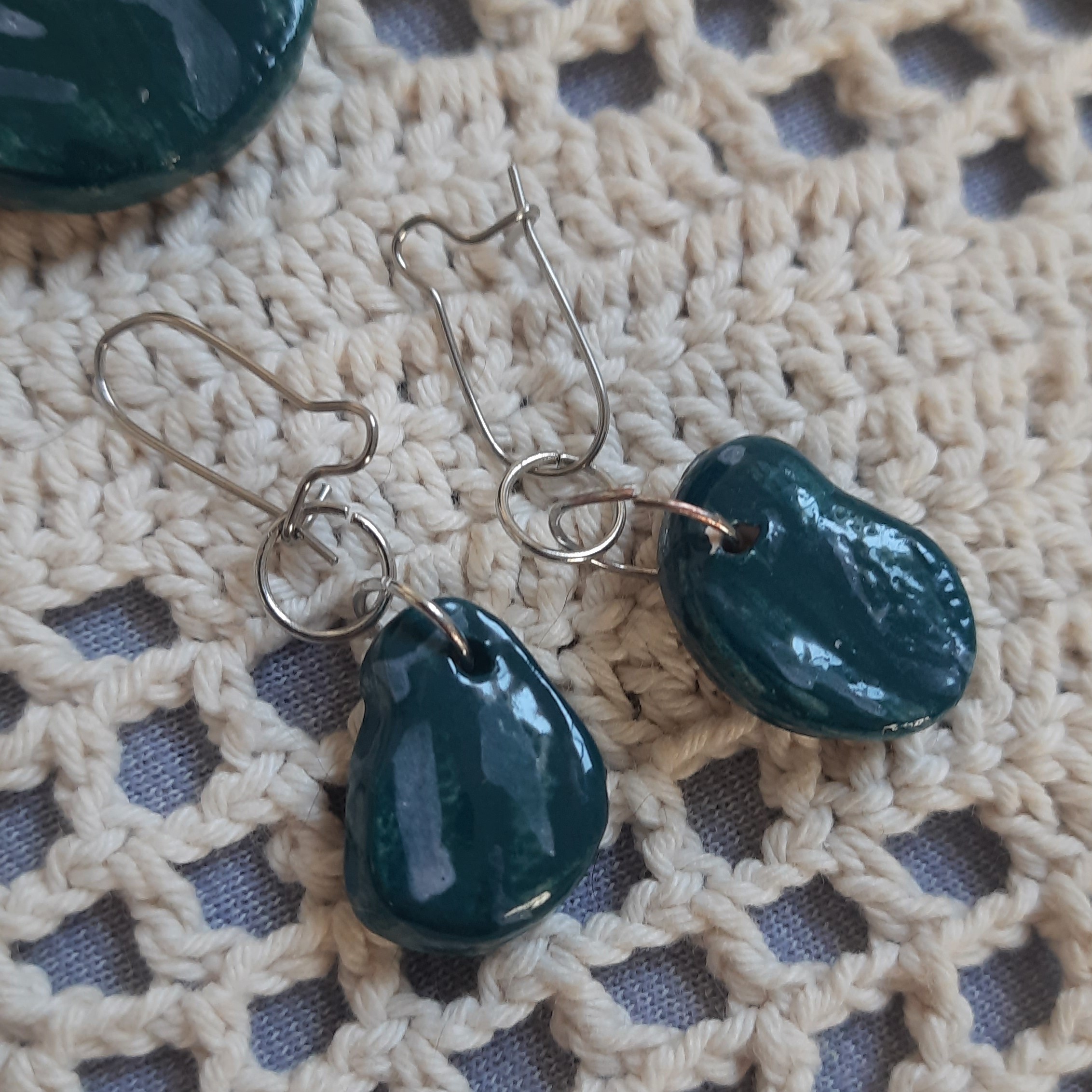 Brincos feitos à mão em cerâmica fria, com gancho de metal prata.