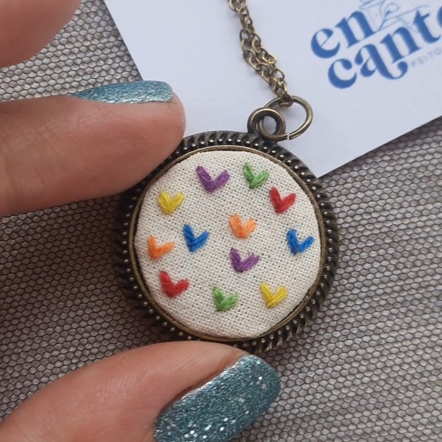 Pingente duplo em liga de metal com bordados à mão dos dois lados.